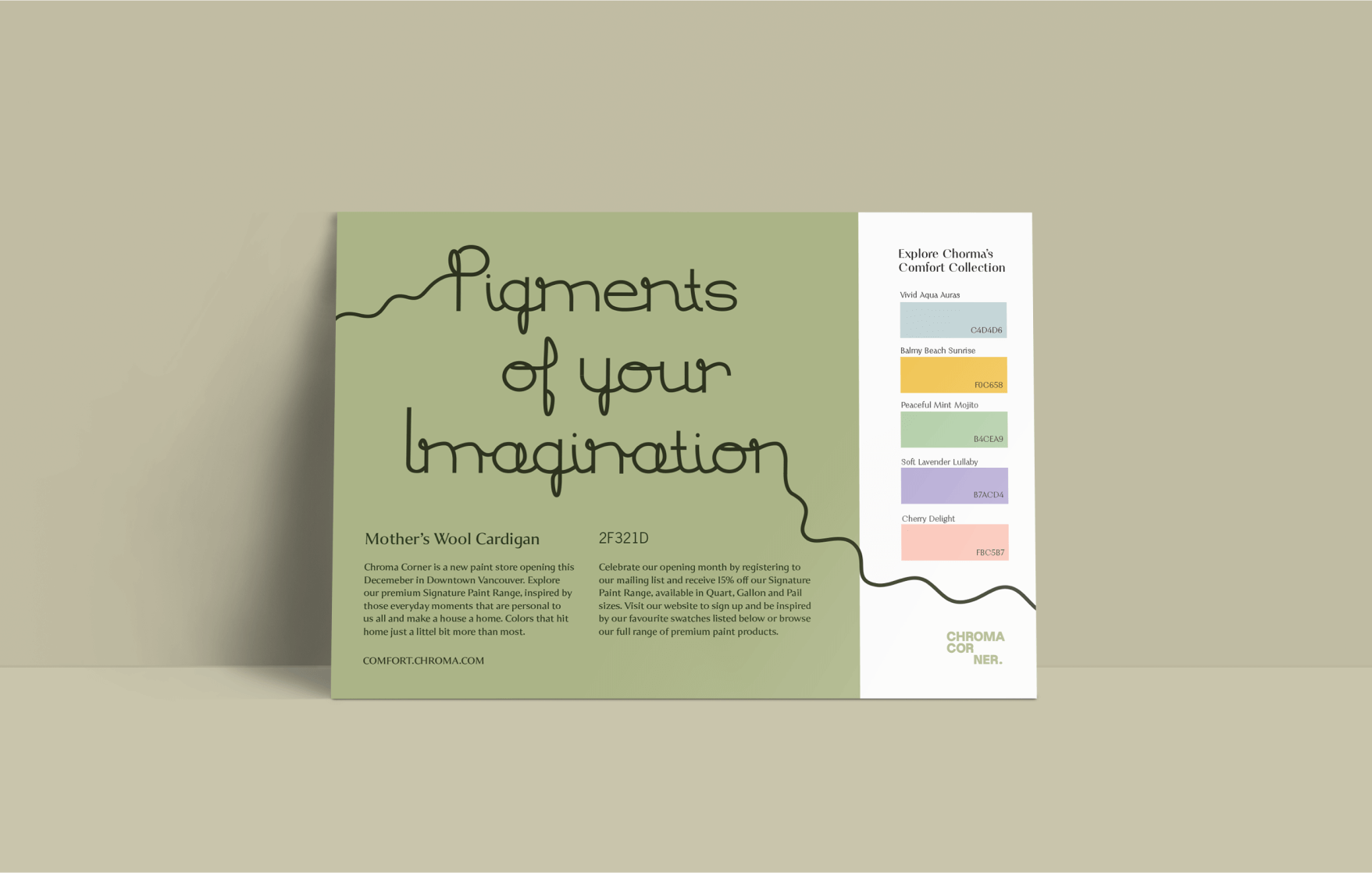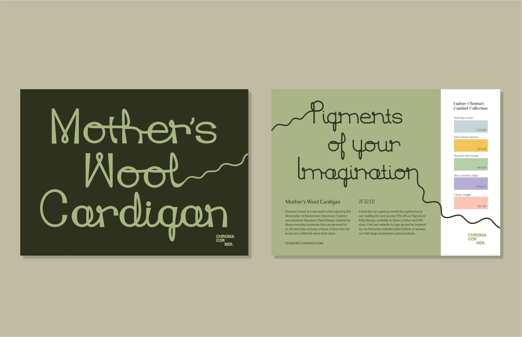 Chroma Corner is an emerging paint company offering home improvements with a personable and stylish touch. Celebrating their launch with a promotional post card, designed with a custom type to elevate this meaningful product.